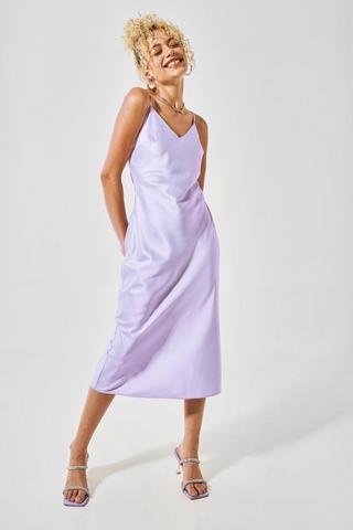 An iconic party look made for nights that should never end! This satin slip dress has adjustable straps, a v-neckline and a midi length. Complete the look with slip on heels and your favourite accessories.
